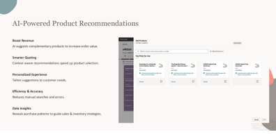 Suggests complementary products to boost deal value. Context-aware, tailored to customer needs. Reduces search time and minimizes errors.